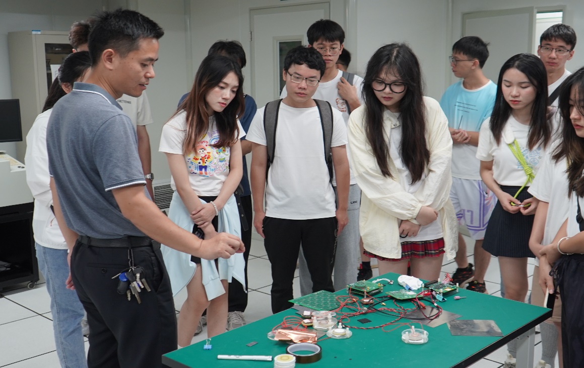 7月13日下午,实践队伍来到华中科技大学,在光电学院副院长聂明局带领下依次前往校史馆、集成电路产教融合平台、武汉光电国家研究中心展厅参观。在相关专家的讲解下,切身感受华中科技大学的深厚科技底蕴以及集成电路芯片的前沿制造工艺与创新发展。
