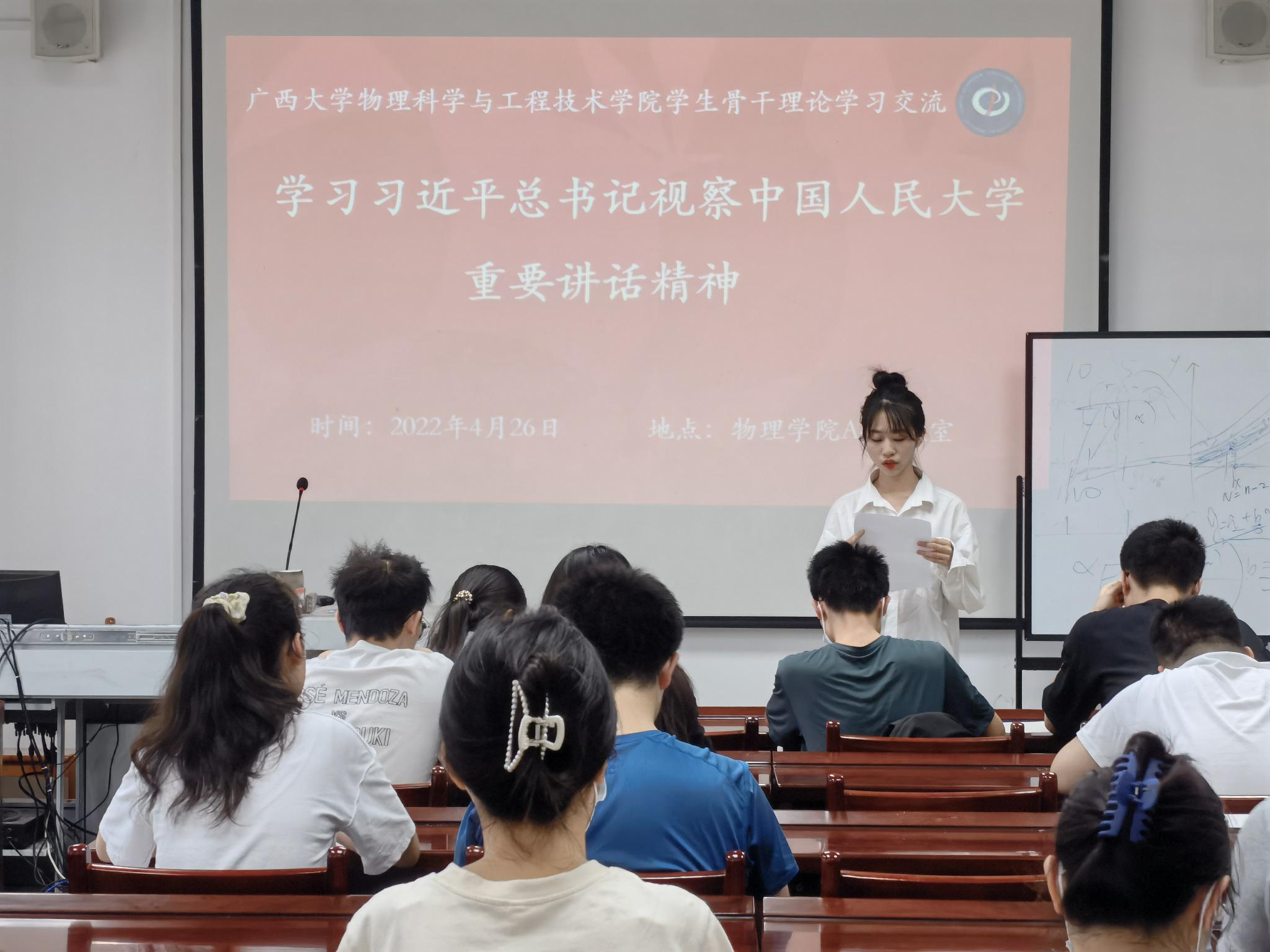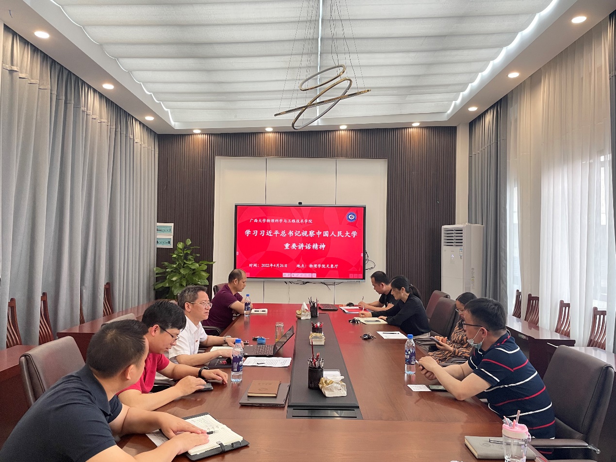 学院领导班子成员中心组理论学习会上,结合自身工作实际,分别畅谈体会感想。常务副院长王祥高提出,习近平总书记的讲话对中国高等教育办学方向提出了明确方向,结合新一轮一流学科建设,我们要坚持走中国特色社会主义的一流大学道路,物理学院要把课程思政、解决卡脖子问题、夯实基础教育等三个方面结合起来,坚持学科特色的发展,把习近平总书记的思想作为核心深化到实际工作中来,服务广西、建设广西、为壮美广西贡献应有力量。