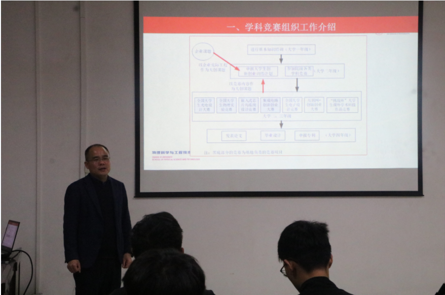会上,陆翔副院长介绍了必赢历年在参加全国大学生电子设计竞赛、全国大学生光电设计竞赛、全国大学生嵌入式芯片与系统设计竞赛、全国大学生集成电路创新创业大赛等学科竞赛的情况,强调参加学科竞赛对提升学生的实践能力、创新能力、团队精神有重要作用;详细解读了参赛流程,分享了必赢历年在参加各类比赛中的成功经验,鼓励同学们积极报名,展现才华。在交流环节,陆副院长耐心解答同学们的疑问、给予指导,并鼓励大家除了参加这些专业的比赛外,还要积极参加全国大学生物理实验竞赛、“互联网+”大学生创新创业大赛、“挑战杯”全国大学生课外学术科技作品竞赛等,并表示学院将大力提供资源和支持。