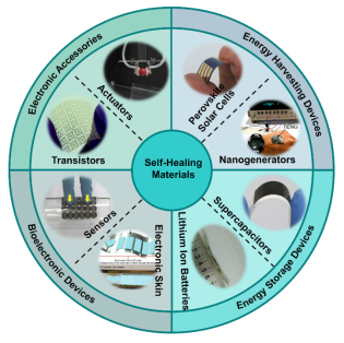 随着智能时代的到来,各种智能便携式/可穿戴电子设备已经成为我们生活中不可缺少的一部分。材料科学、信息技术和制造工艺的不断突破,推动了便携式/可穿戴电子设备在医疗保健、体育、娱乐、安全和环境监测等领域的快速发展。到目前为止,一直致力于提高便携式/可穿戴电子设备的灵活性、轻量化、小型化和多功能性,以满足人们对舒适性、功能和安全性的要求。电子设备由于运行过程中的疲劳、腐蚀或损伤,导致设备故障。维修高集成度的便携式/可穿戴电子设备十分困难,成本高昂。自修复技术为损坏后恢复器件结构和功能提供了有效的解决方案。自修复电子器件是人工自修复系统的主要研究领域之一,它是自修复材料和电子设备的结合,在电子设备损伤后恢复电学性能和功能,提高电子设备的耐久性、可靠性和安全性。