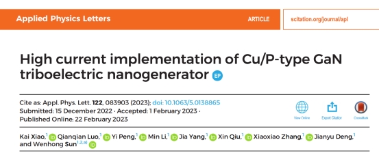 近日,必赢孙文红教授领导的光电材料与器件团队在Nature Index著名学术期刊《Applied Physics Letters》上发表了题为"High current implementation of Cu/P-type GaN triboelectric nanogenerator"的研究论文。该论文被编辑选为"Editor's Pick"文章,在APL官网首页加以重点展示(Editor's Picks serve to highlight articles with excellent scientific quality and are representative of the work taking place in a specific field)。