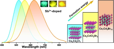 钙钛矿衍生物的丰富相结构由于其高发射效率和可调谐发射而受到广泛关注,并在光电子领域得到了广泛的应用研究。在此,我们探索了一种相选择性溶液合成路线,以获得不同的 Cd 基钙钛矿衍生物。首先,通过溶剂热法获得了原始的四方相Cs7Cd3Br13,经过适当的Sb3+掺杂,其光致发光量子产率(PLQY)从8.28%提高到57.62%。此外,采用卤素取代对 Sb:Cs7Cd3Br13 进行改性,并产生了一系列具有不同晶体结构和从青色到橙色(517-625 nm)的可调发射Cd 基钙钛矿衍生物。结合材料表征和理论计进一步研究和讨论了这种实验现象的本质。本研究提出了一种合成具有不同结构和调制发射的明亮 Cd 基钙钛矿衍生物的有效策略,同时也为理解卤素取代的结构/发射调制提供了见解。