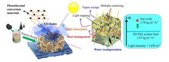 太阳能水蒸发系统是以太阳能作为能源,利用光热转换材料实现气液界面快速的水蒸发的清洁、高效的水处理技术,在海水淡化,污水处理方面具有十分广阔的应用前景。论文介绍了一种由可再生的壳聚糖高分子材料与光热材料经过精细化冷冻干燥方法制备复合光热气凝胶系统。该系统集光学吸收增强、热学管理、水运输和蒸汽逃逸路径增强等多项功能于一体,各项功能各自兼容,综合的提高了水蒸发效率;这种低成本、环保、简便和高效的太阳能水蒸发系统制备方法,对高性能水蒸发系统的合成和设计具有重要的指导意义。