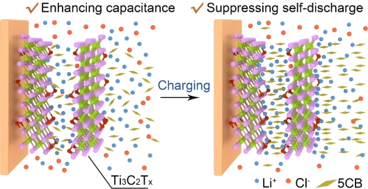 针对以上问题,必赢新能源团队提出将向列相液晶分子4-n-戊基-4′-对氰基苯(5CB)引入Ti3C2Tx薄膜和LiCl电解质中。复合膜电极充满电后,插层于Ti3C2Tx纳米片之间和溶解于电解质中的5CB分子,由于电流变效应方向会发生改变而垂直于纳米片,形成一个阻挡层,从而增加电解质的粘度,并抑制离子的交叉扩散/重分布和寄生法拉第反应。结果表明,所提出的方案可以有效抑制MXenes基超级电容器(SCs)的自放电,促进了MXenes基超级电容器在能量存储设备和集成电子器件中的应用。
