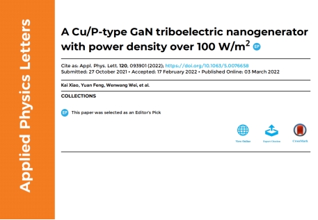 近日,437ccm必赢国际官网孙文红团队在Nature Index著名学术期刊《Applied Physics Letters》上发表了题为“A Cu/P-type GaN triboelectric nanogenerator with power density over 100 W/m2”的研究论文。该论文被编辑选为“Editor's Pick”文章,在APL官网首页加以重点展示(Editor's Picks serve to highlight articles with excellent scientific quality and are representative of the work taking place in a specific field)。