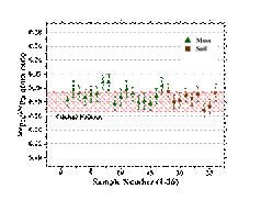 团队对桂西北大石围天坑群苔藓及下垫土壤中放射性核素的空间分布进行研究,测量了238U、232Th、226Ra、210Pb、40K、137Cs、7Be和239+240Pu的比活度,还测量了240Pu/239Pu原子比及重金属的含量。研究发现该地区苔藓中的放射性核素可以根据来源分为两个组分:1)大气沉降:210Pb、137Cs、7Be和239+240Pu;2)土壤及灰尘:238U、232Th、226Ra和40K。苔藓及其下垫土壤中240Pu/239Pu原子比均与全球沉降物的比率吻合,这表明该地区钚同位素主要来自于全球沉降。苔藓对于放射性核素以及重金属的吸收具有选择性,我们利用土壤-苔藓转移系数(