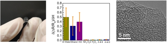 必赢纳米能源研究中心邓承浩课题组硕士生赵斯麒等人制备了基于单根碳纳米线圈的柔性湿度传感器件,针对其响应机理、湿度响应调控,以实现独立的温湿度微纳传感器件为目标,开展了系统研究。研究发现,由于独特的弹簧结构,单根碳纳米线圈在较大的应变范围内可以保持其温湿度响应不变。通过氨水处理的单根碳纳米线圈,其湿度响应受到了极大的抑制,在20%至90%的湿度范围内,其电阻几乎保持不变,但其温度响应并未受到明显影响。经过X射线光电子能谱、红外光谱和能量色散谱分析及电导率统计发现,氨水处理在碳纳米线圈中引入了非挥发的饱和水分子,这些水分子经由多晶-非晶混合结构中存在大量的空位渗入碳纳米线圈。