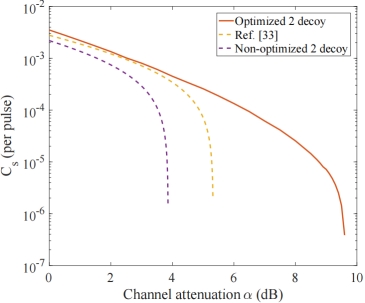 量子安全直接通信(QSDC)近年来取得了显著的发展。量子安全直接通信可以在量子信道中直接传输秘密信息,不仅可以感知窃听,而且可以抵抗窃听,使窃听者无法获得任何信息。诱骗态QSDC方案为预防窃听者的分子数分离(PNS)攻击提供了有效的措施。然而诱骗态QSDC的实用化仍面临着实验复杂性高、忽略参数优化等挑战。本研究设计了一个实用的双诱骗态QSDC方案,并将GA(Genetic algorithm)算法引入QSDC中对参数进行优化。该方案相较于已提出的四诱骗态QSDC方案具有更低的实验复杂度,可能是开发实用诱骗态QSDC系统的最佳选择。如图1所示,本研究的方案在高损耗的情况下,相较于的已提出的四诱骗态QSDC方案[Photon. Res. 8, 1522 (2020)]具有更高的保密容量。同时,全参数优化在一定程度上提高了实际QSDC系统的性能。采用GA算法全参数优化后,不仅提高了保密能力,而且扩展了安全距离。该研究有效地促进了实用的诱骗态QSDC系统的开发。