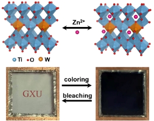 锌离子驱动的电致变色器件(ZECD)是新一代节能透明电子器件。当前,几乎所报道的ZECD都使用经典的氧化钨作为电致变色阴极。氧化钨在酸性电解质中极易受到腐蚀,严重恶化ZECD的循环稳定性能。在本工作中,作者研究了具有高化学稳定性的二氧化钛纳米晶在锌离子驱动下的电致变色性能。研究表明,采用钨掺杂锐钛矿二氧化钛纳米晶,可以显著降低Zn离子嵌入扩散的势垒。基于钨掺杂二氧化钛纳米晶构筑的ZECD,具有高光调制范围(550 nm处为66%)、快速的光谱响应时间(550 nm处着色/褪色时间为9/2.7秒)和良好的循环稳定性能(1000次循环后光调制损耗为8.2%)。