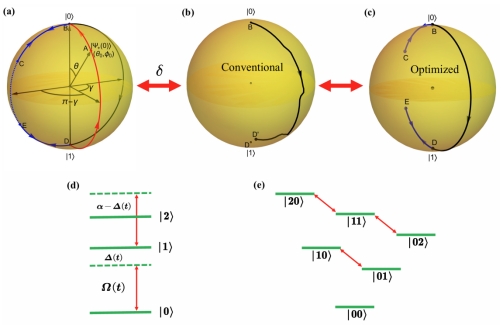 图1:(a)-(c)设计的几何量子门在布洛赫球上的循环演化轨迹图。(d)-(e)超导Transmon量子比特的能级示意图。