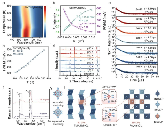 研究采用溶剂热法或盐酸辅助粉末策略合成了一维锑掺杂TMA2NaInCl6TMA为四甲基铵)有机-无机杂化双钙钛矿。该材料表现出以583 nm为中心的宽带黄色发射,半峰宽为239 nmPLQY高达98.9%。新型一维双钙钛矿材料Sb3+TMA2NaInCl6在激发态下表现出较强的电子-声子相互作用,远远大于三维双钙钛矿材料。通过理论计算发现Sb3+掺杂调节了TMA2NaInCl6中的电子态密度分布,从而显著提高了自捕获激子发射的PLQY。对跃迁偶极矩的计算表明,跃迁概率增加了24倍。该研究还表明,黄色发光Sb3+TMA2NaInCl6具有良好的热稳定性,在高功率LED、光电探测器等方面具有广泛的应用前景。