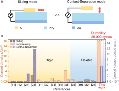 本研究通过对比摩擦滑动、按压、和接触-分离运动三种不同机械激励模式下的输出特性,发现具有肖特基接触的半导体界面在接触-分离运动模式下也具有摩擦伏特效应,并且输出直流电的电流密度可达16.00 A m-2、单次机械激励输出电荷量可达98.72 mC m-2、峰值功率可达5.40 W m-2,输出性能优于大多数已报道的半导体直流发电机。尤为重要的是接触分离式的机械运动激励可以有效地避免摩擦滑动模式下的磨损问题,超过20000次循环测试后,发电输出没有明显下降。而且,由于使用了有机半导体材料,器件整体具有柔性,在多次弯折前后也可保持性能稳定。此外,接触分离模式下界面接触应力较小,局部热效应远低于摩擦滑动模式,电子激发更可能是因为界面原子电子云重叠释放的键合能量,类似于界面的“机械化学”过程,这种新模式下的发电器件的研究有助于进一步深入理解摩擦伏特效应的物理机制。