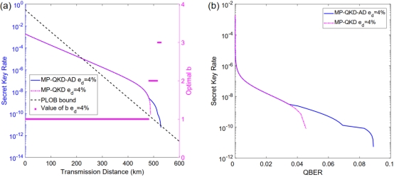 时,(a)所提出方案(MP-QKD-AD)与原始MP-QKD方案的性能对比结果,b值为分块数目;(b)所提出方案(MP-QKD-AD)与原始MP-QKD方案的最大容忍量子误码率对比结果。