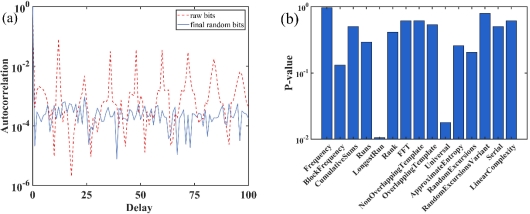 图3:(a)随机比特的自相关测试。测试文件的数据大小为107位。红色虚线表示原始比特,蓝色实线表示最终的随机比特。(b)NIST测试的结果。测试项目的显著性水平设为0.01。