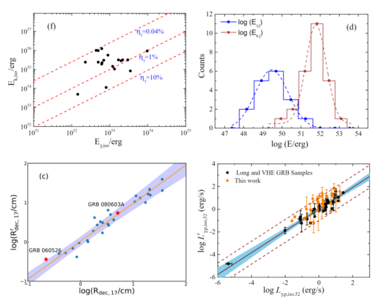 伽马射线暴(伽马暴,GRB)早期光学余辉光变曲线的onset特征是薄壳层情景标准外激波模型下的理论预测结果,必赢博士生张璐璐与导师梁恩维教授合作在伽马暴余辉光变的样本分析研究中取得进展。通过收集整理Swift卫星发射以来的光学和X射线余辉的观测数据,选择了早期光学光变曲线呈现明显标准光变曲线特征的30个伽马暴样本。基于标准正向外激波型、采用贝叶斯推断方法,我们拟合了这些样本的光学和X射线余辉观测数据,给出相关物理参数的后验分布,计算了与喷流相关的物理量。研究发现,该样本的瞬时辐射效率分布范围为0.04%-10%,与物质主导喷流模型预测的低辐射效率一致。经几何修正后,瞬时辐射能量和喷流动能均表现为比较紧凑的正态分布,与前人提出的伽马暴喷流具有标准能量库的假设相吻合。特别地,研究发现火球减速半径(Rdec)、初始磁场强度(B0)以及磁场和电子的能量分配比例参数σB(σB=εB/εe)之间存在紧凑的依赖关系Rrdec,17=101.00±0.05B0-0.83±0.06σB0.26±0.02,该关系推断不同样本的喷流中电子所携带的能量占比基本一致。该样本同典型的长伽玛暴在3σ置信度水平内同样遵循Lγ,iso − Ep,z − Γ0三参量关系。本研究成果已被《The Astrophysical Journal》杂志接受发表。