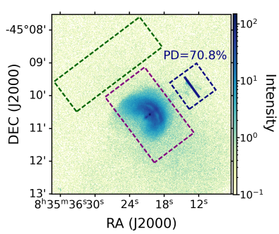 研究发现,Vela脉冲星风云的喷流具有很高的偏振度,其磁场方向与喷流的出射方向垂直,这符合传统理论中脉冲星风云的喷流起源。传统理论中喷流的起源被认为是脉冲星抛射出的高纬度星风在磁环向应力的作用下,汇聚在脉冲星及冠区上方后受挤压而驱动的。在该模型框架下,喷流内部的磁场是环向的,方向与喷流方向垂直,观测结果与其一致。此外,在喷流中发现了较高偏振度,这表明该区域具有有序的磁场结构。考虑到Vela脉冲星风云的喷流具有螺旋性,以及喷流区域整体的高偏特性,可以推断出喷流的磁场并不会随着喷流形态结构的改变而改变。相关文章成果已经被《Monthly Notices of the Royal Astronomical Society》接收。