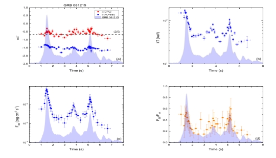 3. GRB 081215的α和Γ (a)kT (b)FBB (c)FBB/Ftot (d)的时间演化。