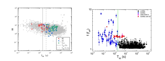 1. 左图:我们的SGRB with EE样本和其他长、短伽马射线暴的HR-T90散点分布右图:我们的SGRB with EE样本和其他长、短伽马射线暴的有效振幅feff-T90散点分布