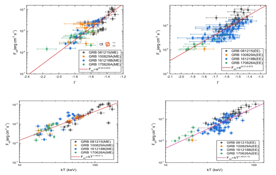 4. 四个GRB (081215, 100829A161218B170626A)MEEE相的Ftot-Γ,FtotkT相关性。