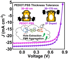针对以上问题,必赢薄膜光伏团队与福建海峡实验室、韩国浦项科技大学合作,选择具有给体-受体-锚定集团的小分子材料2F来修饰PEDOT:PSS,通过提高导电性来克服界面层的膜厚限制。研究证实,2F小分子聚集在了ITO表面,形成了偶极层,从而改善了PEDOT:PSS的聚集方式,提高了电导率、增加了功函数,最终表现出了更好的电荷提取效率以及更低的漏电流密度。因此,2F修饰的PEDOT:PSS界面在基于PM6:Y6作为活性层的有机光伏电池中,实现了17.1%的效率,高于对照组器件的15.7%,效率的提升主要来源于由电荷提取导致的电流密度提高。而且,当进一步将界面层的膜厚提高到170nm后,以2F修饰PEDOT:PSS为界面层器件的效率仍然实现了超过15%的效率,体现了其优异的膜厚容忍性。利用1,3,5-三溴苯作为固体添加剂后,以2F+PEDOT:PSS为界面层的基于PM6:Y6、PM6:BTP-eC9、PM6:L8-BO器件的效率分别达到了18.3%、19.2%和19.1%。该研究揭示了通过小分子策略修饰空穴界面层来提高器件性能的有效性,对于有机光伏电池的产业化应用具有深刻意义。
