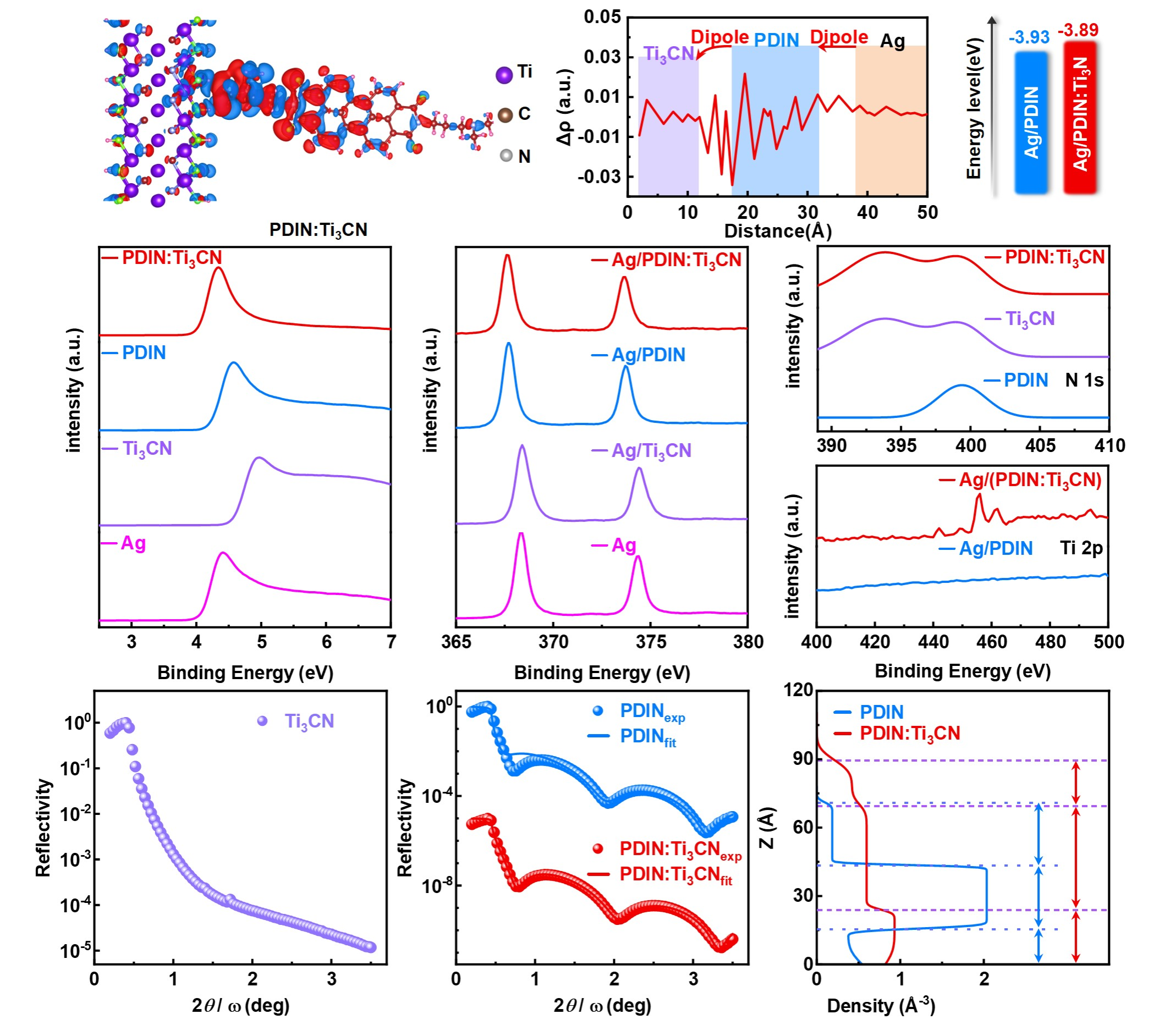 针对以上问题,必赢薄膜光伏团队联合四川大学和淮北师范大学采用混合阴极界面层策略(将具有高光学透明度和优异导电性的MXenes二维材料Ti₃CN,修饰PDI及其衍生物)调控PDI分子的聚集行为,揭示Ti₃CN与PDI界面层的N-N耦合作用机制。当在PDIN中引入1 wt%的Ti₃CN时,Ti₃CN表面钛原子通过电子转移与含有氨基的PDIN形成定向偶极结构。N-N相互作用下Ti₃CN:PDIN混合阴极界面层有更合适的能级匹配,增强导电性,从而提升电荷提取性能。此外,Ti₃CN的引入有效调控了PDIN薄膜的垂直相分布,使PDIN更加致密有序,降低陷阱态密度,形成更光滑的表面,从而构建高效的电子传输路径,显著增加了阴极界面层的膜厚耐受性。将该界面层应用于PM6:BTP-eC9和PM6/L8-BO有机太阳能电池器件时,分别实现了20.0%和19.5%的PCE,器件稳定性得到提升。本研究提出的N-N耦合策略为开发高效有机太阳能电池混合阴极界面层提供了新的见解。