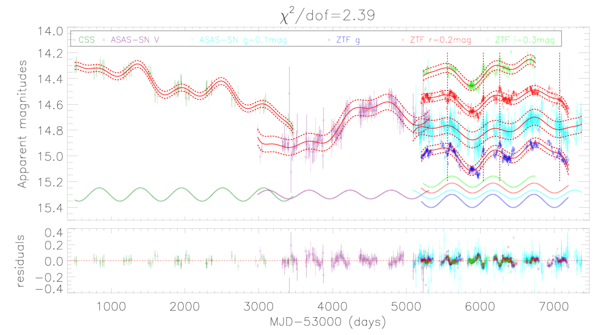 Fig. 1: Top panel shows the long-term light curves from different sky survey projects and the best fitting results by the sine component (periodicity about 550days) plus a polynomial component.